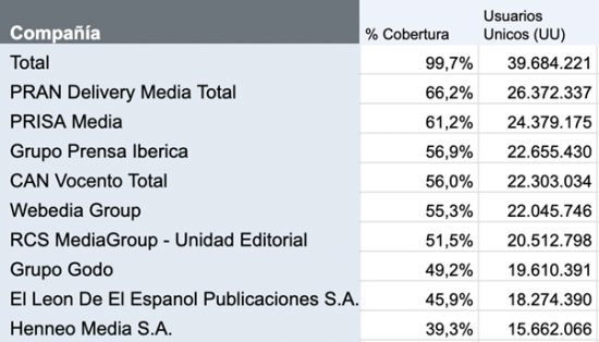 - PRISA Media: Con un 61,2% de cobertura y 24,3 millones de usuarios únicos.