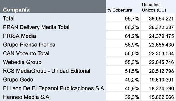 - Grupo Prensa Ibérica: Alcanzando un 56,9% de cobertura y 22,6 millones de usuarios únicos.