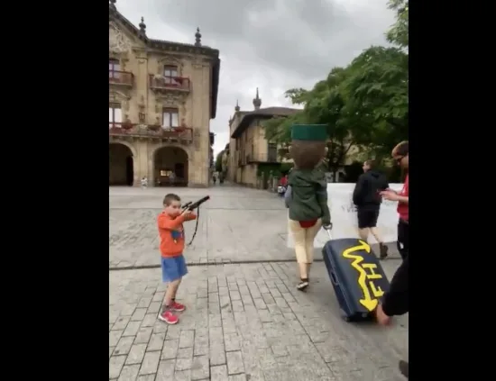 Oñate (Guipúzcoa). Celebración del grotesco espectáculo contra la Guardia Civil, el “Alde Hemendik Eguna” (Que se vayan de aquí). Aquí vemos a un niño simulando disparar a un agente. Una sociedad fanática y enferma y un gobierno central incluso más. pic.twitter.com/SqQy4go2mP