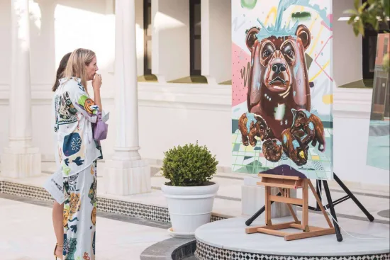 El pasado viernes 5 de julio, Eneaverso llevó a cabo en Marbella su tercera exposición de arte colectiva, bajo el título “Desactiva la Trampa”. El evento, que se desarrolló en la evocadora residencia Alhambra Palace, reunió a 15 artistas que presentaron un total de 25 obras pictóricas y escultóricas. Este espacio, una joya arquitectónica que fusiona la estética tradicional andaluza con influencias moriscas, fue cedido por Solvilla, la promotora y asesora inmobiliaria de alta gama con sede en Marbella.