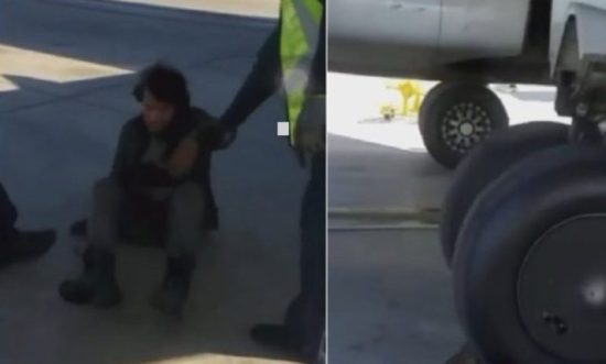 Un video grabado por un funcionario muestra al joven que tras bajar de uno de los compartimentos del avión, un Boeing 737, se tambalea y se sienta en la pista de aterrizaje con el rostro desencajado, ante la mirada de los trabajadores.