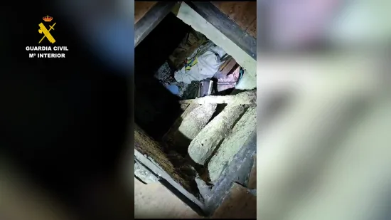 En el registro se ha localizado -en el suelo de una de las habitaciones- una cceso a un pequeño habitáculo soterrado con escaleras que coincide con la descripción facilitada por la víctima. Los agentes encontraron numerosas bridas, armas blancas y una escopeta de aire comprimido. Era un entorno totalmente insalubre, con mucha suciedad acumulada y abarrotada deobjetos y basura.