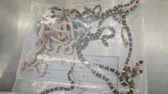 Un video muestra a dos agentes fronterizos inspeccionando bolsas de plástico transparentes llenas de serpientes rojas, rosas y blancas retorciéndose.