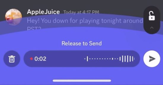 Los mensajes de voz están disponibles en Discord para su envío a través de los mensajes directos, los mensajes directos grupales y en un servidor con menos de 200 miembros, y solo en la versión para teléfono móvil.