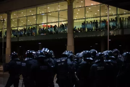 El otro agente estaba en los alrededores del aeropuerto de El Prat, donde «había grupos radicales violentos que trataban de asediar el edificio y los alrededores atacando a los compañeros mediante el lanzamiento continuado de objetos con capacidad lesiva y barricadas».