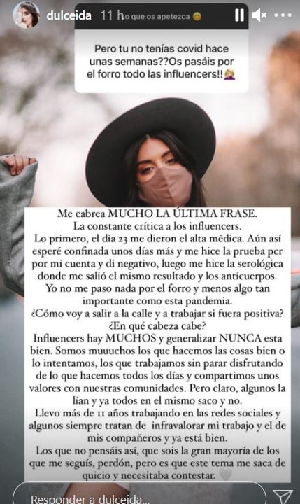 Una de las preguntas de sus seguidores fue que si ella no tendría que estar encerrada por dar positivo en coronavirus, alegando también que las influencers hacían lo que les daba la gana sin pensar en las consecuencias. La catalana no tardó en responder molesta aclarando que estaba siendo responsable y que había seguido al dedillo el protocolo. «Lo primero, el día 23 me dieron el alta médica. Aún así, esperé confinada unos días más y me hice la prueba PCR por mi cuenta y di negativo. Luego me hice la serológica donde me salió el mismo resultado y los anticuerpos», respondió
