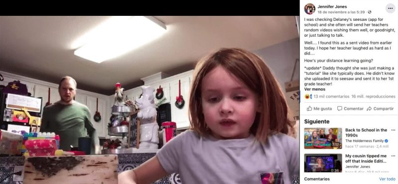 “Estaba la aplicación de la escuela de Delaney y a menudo envía a sus profesores videos al azar deseándoles lo mejor, o buenas noches, o simplemente hablando por hablar. Bueno…. encontré esto como un video enviado esta mañana. Espero que su profesora se haya reído tanto como yo….”, compartió su madre, Jennifer, en su cuenta de Facebook.