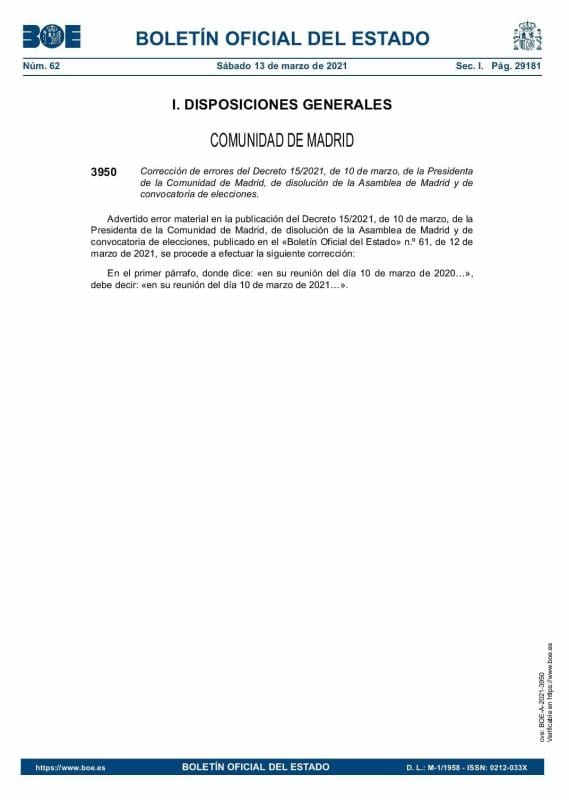 En concreto, “advertido error material”, el BOE publica la “corrección de errores” habida cuenta que el decreto de disolución y convocatoria electoral “en el primer párrafo, donde dice: ‘en su reunión del día 10 de marzo de 2020…’, debe decir: ‘en su reunión del día 10 de marzo de 2021…’”.