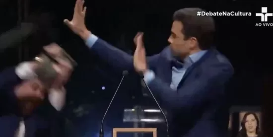 El candidato socialista, José Luiz Datena, mete un sillazo al candidato de derechas, Pablo Marçal, en pleno debate para la alcaldía de São Paulo. pic.twitter.com/cJS1VSZTRY