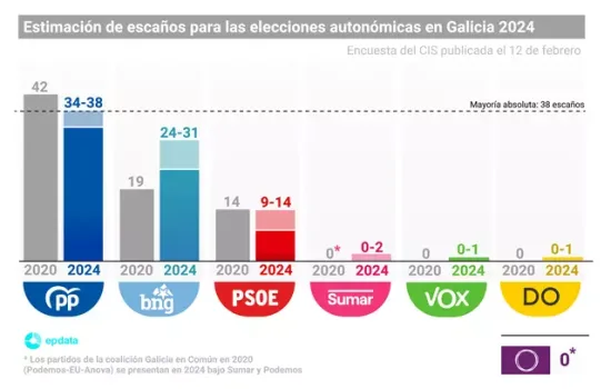 El PP podría perder el próximo domingo la mayoría absoluta en Galicia fijada en 38 diputados, el techo que le otorga el último barómetro del Centro de Investigaciones Sociológicas que mantiene a los populares entre los 34 y los 38 escaños y vuelve a disparar las posibilidades del BNG de Ana Pontón con un 33,4% de intención de voto y una horquilla de entre 24 y 31 diputados.
