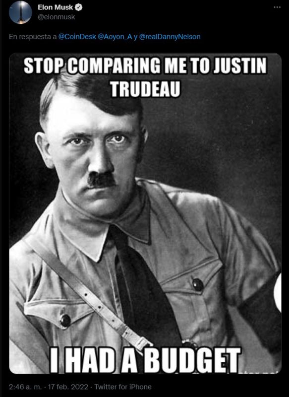 Elon Musk tuiteó la madrugada de este jueves un meme de Hitler con la leyenda: “Dejen de compararme con Justin Trudeau. Yo tenía un presupuesto”.