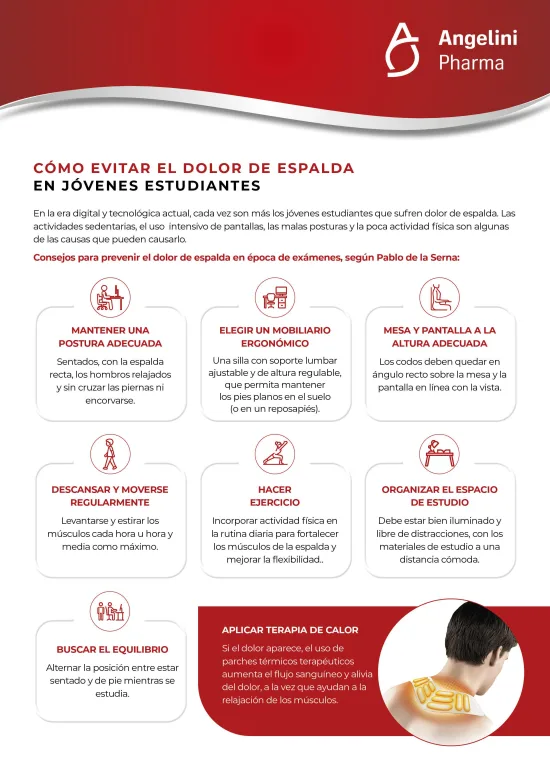 Y entonces es cuando aparece el dolor de espalda, «que no solo afecta el bienestar físico de los estudiantes, sino que también puede tener un impacto negativo en su rendimiento académico y su calidad de vida en general», advierte el experto, colaborador de Angelini Pharma. Además, «la incomodidad constante puede dificultar la concentración, lo que a su vez puede afectar su capacidad para aprender y retener información».