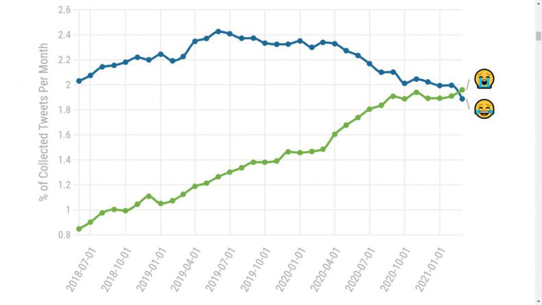 Durante los últimos años era el símbolo de la risa el más compartido por los usuarios, pero a partir de inicios de este año 2021, se envía en menor medida que el de la cara llorososa, que crece a ritmos descompensados