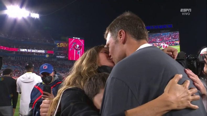 En el campo durante la celebración de la victoria, se pudo ver uno de los momentos más esperados del evento. El beso de la estrella del partido con la modelo brasileña que enamoró a todos los fans del fútbol americano y a los no tan aficionados. Sin duda también a más de uno se la caerían las lágrimas al emotivo abrazo de familia entre padre, madre e hijos.