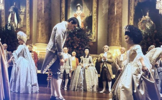 La precuela sobre la vida de la monarca se desarrolla en dos períodos temporales, los años 1761 y 1817. En el primer episodio, en una escena de la juventud de Carlota, la protagonista a la que interpreta India Amarteifio acude aun baile en un lujoso salón.