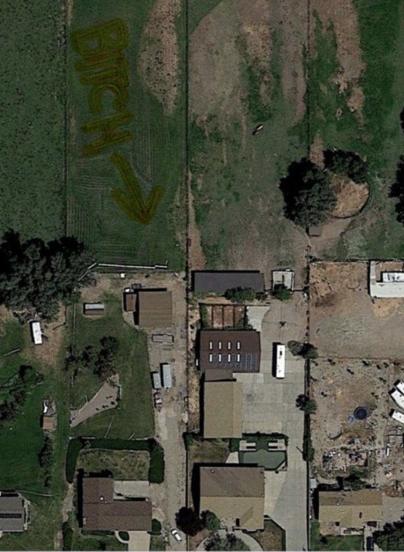 El usuario ‘JuKeChrist16x2’ compartió la curiosa instantánea en la que se puede leer en grandes letras la palabra «zorra» en inglés (Bitch) cortadas sobre el césped junto con una flecha apuntando hacia una casa.
