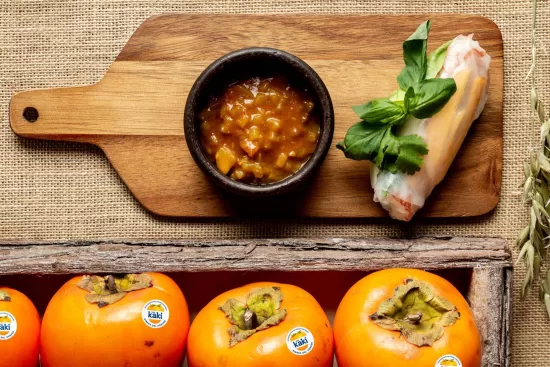 Una receta fresca y ligera que presenta el Kaki D.O.P. Ribera del Xúquer en forma de rollitos vietnamitas, acompañados de langostinos y una deliciosa salsa sweet chili, para un contraste de sabores exóticos.