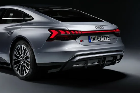 Con el RS e-tron GT performance, Audi estrena su primer modelo RS performance totalmente eléctrico y es ahora más deportivo. Su frontal presenta un aspecto mucho más radical, con el Singleframe invertido, en el que predomina la característica estructura de nido de abeja tridimensional de los modelos RS. El faldón que enmarca el contorno negro de la parrilla extiende visualmente el RS e-tron hacia abajo. El vehículo da la impresión de estar más cerca del asfalto en combinación con los blades funcionales en forma de L. La zaga del RS e-tron GT toma prestados elementos de diseño procedentes del mundo de la competición. El difusor aerodinámico refleja el motivo de los elementos de eficiencia tridimensionales en la parte delantera, como los blades en forma de L en la zaga, que están acabados en el color de la carrocería para darle un aspecto deportivo. Otro detalle de competición es un reflector vertical rojo situado entre los canales aerodinámicos.