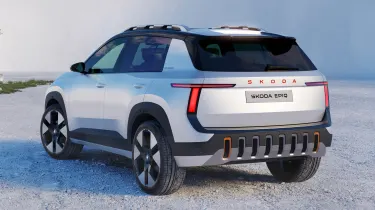 El perfil lateral presenta pasos de rueda pronunciados, rodeados por un revestimiento negro, mientras que una línea de hombros distintiva se extiende sobre las ruedas traseras con un pilar C en forma de aleta de tiburón encima. El techo se inclina suavemente hacia la parte trasera, formando un spoiler aerodinámico, mientras que hay más luces LED en forma de T y una repetición de los ocho paneles verticales del frente en el parachoques trasero. Una vez más, el nombre de Skoda aparece escrito en la tapa del maletero.