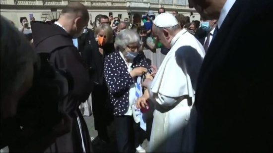 Según han recogido las imágenes del Centro Televisivo de Vaticano, el Pontífice se ha parado a saludar algunos fieles y se ha detenido unos minutos ante esta mujer que se ha levantado la manga de la chaqueta para mostrar el número tatuado en su antebrazo. Francisco se ha acercado para besarlo.