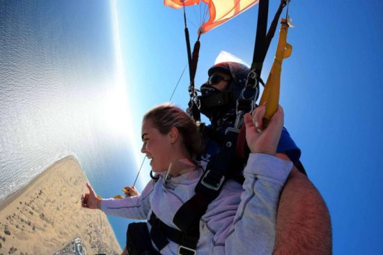 El paracaidismo tándem se caracteriza por la conexión del principiante al instructor experto, mediante un sistema de fijación de máxima seguridad y última tecnología. De esta manera, el usuario experimentará las mismas sensaciones de un paracaidista profesional cuando vuela en caída libre por los cielos de Gran Canaria, disfrutando de un paisaje encantador, con impresionantes vistas de la costa y las montañas, con aterrizaje en las hermosas Dunas de Maspalomas.
