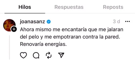La modelo ha compartido este fin de semana en ‘Threads’ -la nueva app de texto de Instagram- un mensaje subido de tono en el que muchos han visto una referencia a la víctima de su todavía marido. «Ahora mismo me encantaría que me jalaran del pelo y me empotraran contra la pared. Renovaría energías» confesaba, sin imaginarse la oleada de críticas que surgirían en su contra al ver similitudes entre su deseo y lo que declaró ante el juez la chica a la que el brasileño habría violado en el baño de la popular discoteca el 30 de diciembre de 2022.