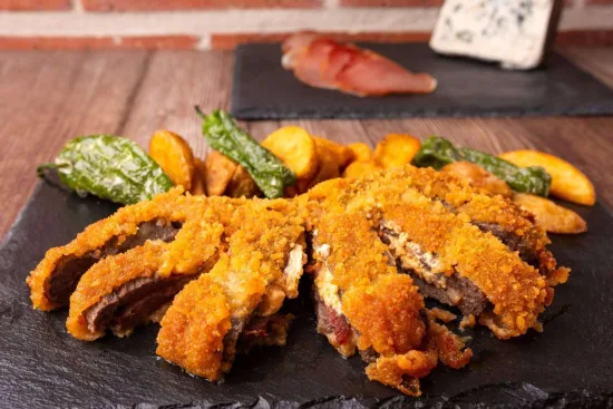 Por otro lado, se puede elegir cachopo a base de lomo de cerdo relleno con jamón, queso manchego y pimientos del piquillo o elaborado con pollo, beicon, boletus, y queso edam.