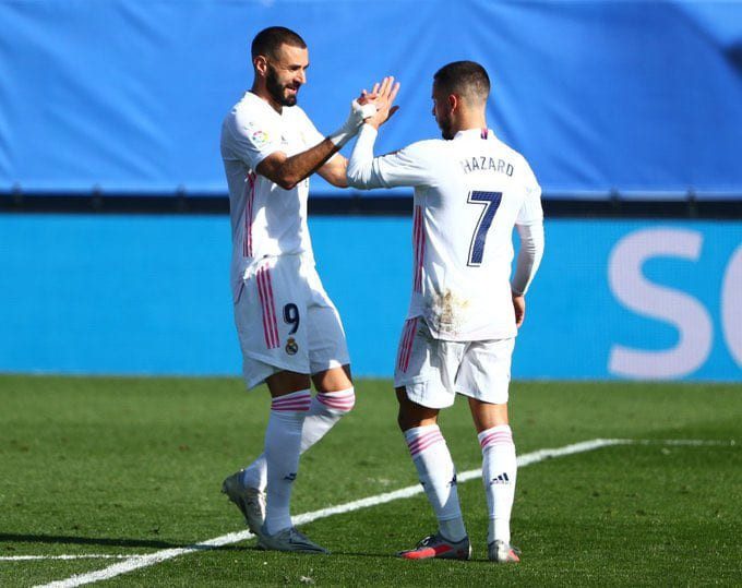Hazard llevaba 392 días sin marcar, es el primer gol de la temporada y el segundo desde que viste la camiseta del Real Madrid, pero se mantuvo frío ante la felicitación de sus compañeros. La primera parte no sólo se había puesto a favor de los blancos, sino que el marcador también les dio la razón. Mucho más cuando Benzema dibujó el segundo en una buena acción personal rozando el tiempo de descanso.