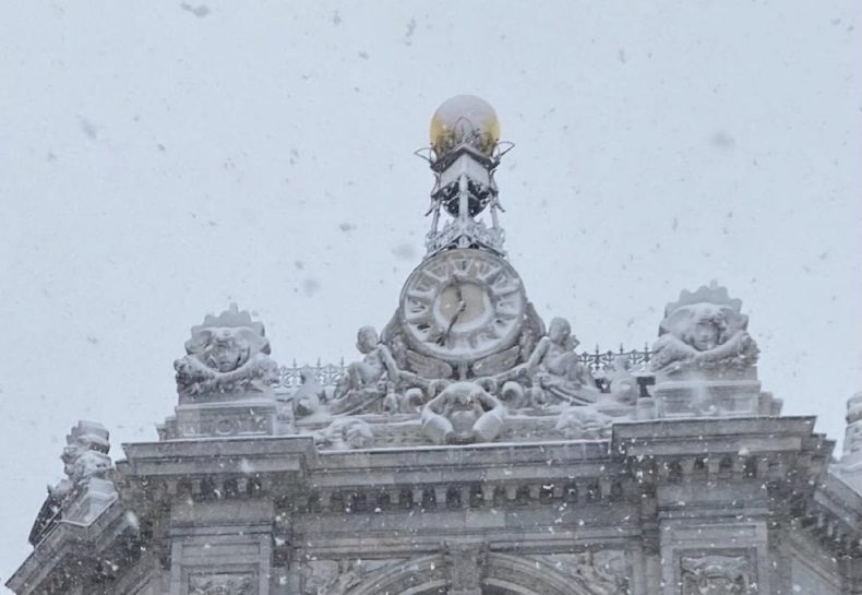 El reloj de la sede del edificio del Banco de España en Madrid se paró el pasado fin de semana a causa del temporal de nieve ‘Filomena’, paralizándose por primera vez en sus casi 130 años de existencia por momtivos distintos a su mantenimiento, según han indicado desde el organismo supervisor.