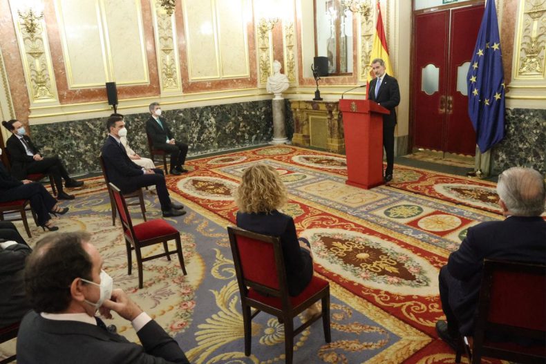 En el acto, que ha tenido lugar en el Salón de Pasos Perdidos, han estado presentes el presidente del Gobierno, Pedro Sánchez; la presidenta del Congreso, Meritxell Batet; la presidenta del Senado, Pilar Llop; el presidente del Tribunal Constitucional, Juan José González Rivas; y el presidente del Tribunal Supremo y el Consejo General del Poder Judicial, Carlos Lesmes.