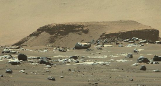 Durante este tiempo, dos de las cámaras del ‘Perseverance’, la Mastcam-Z y la SuperCam Remote Micro-Imager (RMI), capturaron imágenes de su entorno, incluyendo fotos de larga distancia del borde del afloramiento y de una formación conocida como Kodiak butte, un afloramiento más pequeño que los geólogos planetarios suponen que pudo estar conectado al afloramiento principal en forma de abanico pero que se ha erosionado parcialmente.