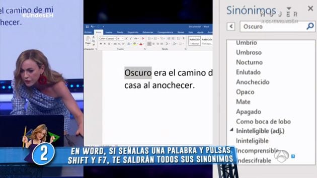 La actriz mostró un truco informático con el que conquistó a gran parte de los espectadores y sobre todo a los estudiantes. La santanderina explicó que desde el programa Word, seleccionando una palabra y pulsando las teclas ‘Shift’ y ‘F7’ aparecerán todos los sinónimos que estén registrados. Un consejo que se hizo viral en redes sociales.