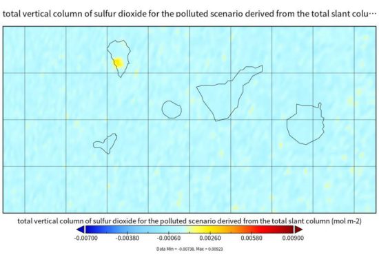 Los resultados obtenidos para este segundo día de la erupción reflejan una tasa de emisión de SO2 entre las 7.997 y 10.665 toneladas diarias, asumiendo que la velocidad del viento a 3.000 metros durante el día de ayer ha estado entre los 4,2 y 5,5 metros por segundo (datos meteorológicos proporcionados por la Aemet).