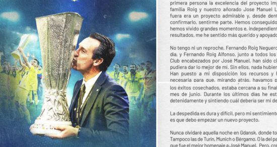 «El Villarreal ha sido mi casa durante los últimos dos años y medio. Mi casa, no mi club, porque me he sentido integrado, querido, identificado y apasionado por el Villarreal CF. He vivido en primera persona la excelencia del proyecto de la familia Roig y nuestro añorado José Manuel Llaneza. Desde fuera era un proyecto admirable y, desde dentro, he podido confirmarlo, sentirme parte. Hemos conseguido éxitos juntos, vivido grandes momentos e, independientemente de los resultados, me he sentido más apoyado y querido que nunca», señaló Emery en una carta en sus redes sociales.
