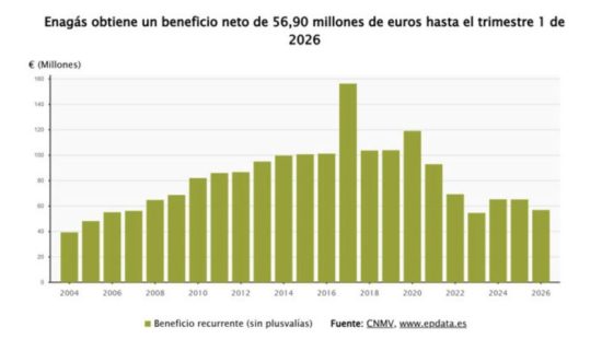 Enagás obtuvo un beneficio neto de 56,9 millones de euros en el primer trimestre del año, un 12,7% menos con respecto al mismo periodo del ejercicio anterior, informó la compañía, que destacó que estas ganancias en los tres primeros meses de 2026 están en línea para alcanzar el objetivo anual de 235 millones de euros.