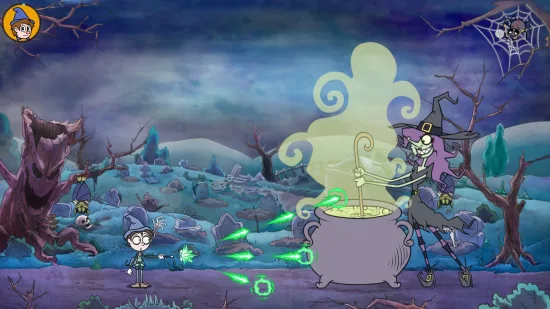 El avance de los niveles que se convierte en un puro plataformas, y tiene un grado de complicación extra por varios motivos: la densidad de enemigos, la diversidad de decorado, y la variedad de hechizos. La cantidad de enemigos que pueden acumularse en una sola pantalla nos dificulta el avance y, como si del propio cuphead se tratase, nos hace sudar al intentar sobrevivir. Las distintas plataformas, algunas son móviles, otras desaparecen, otras serán cocodrilos que saltarán para comernos, y de algunas saldrán pinchos del suelo. Por último, los tres ataques con los que contamos, verde para el hechizo de viento, rojo para el conjuro de fuego, y azul para los proyectiles mágicos de hielo. Cada enemigo podrá tener un escudo protector de un color que deberemos derrotar con el hechizo correspondiente, o algunos serán neutros y podremos atacarles con todos.