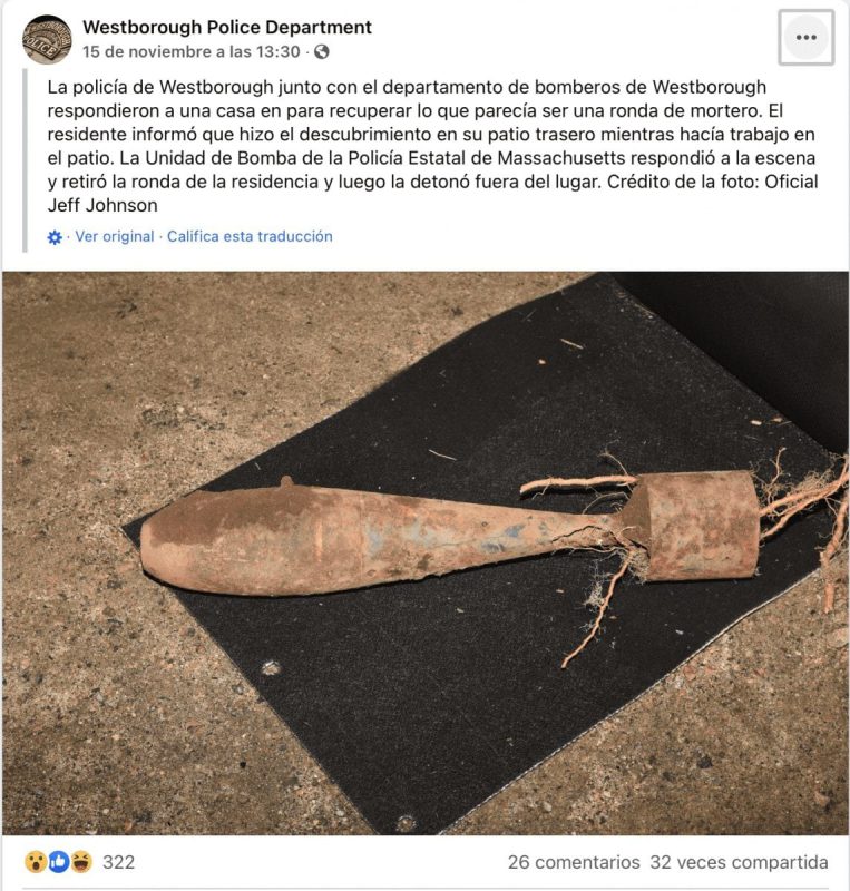 El Departamento de Policía de Westborough confirmó que varios agentes se desplazaron hasta un domicilio particular cuando un hombre que estaba realizando labores en la parte trasera de su casa encontró lo que parecía un artefacto explosivo.