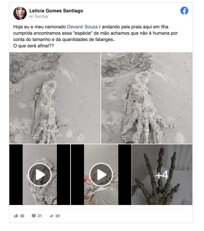 “No creemos que pueda ser humana por el tamaño y la cantidad de falange. Estamos impresionados”, reconoció Leticia Gomes, la mujer que tomó las fotografías y que las hizo públicas en sus redes sociales. También han aparecido expertos que tienen respuestas más terrenales.