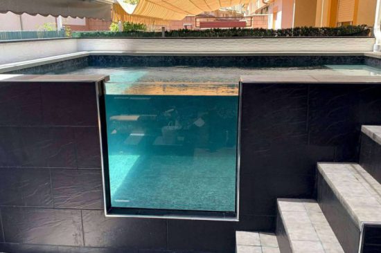 Las paredes de las piscinas que distribuye Esencial Pool son de metacrilato, un material preparado para resistir la presión del agua y las inclemencias de los bañistas. La empresa instala los cristales a la perfección, evitando cualquier tipo de fuga. Además, no requieren de ningún tipo de mantenimiento ni limpieza especial y tampoco tienen un coste muy elevado.