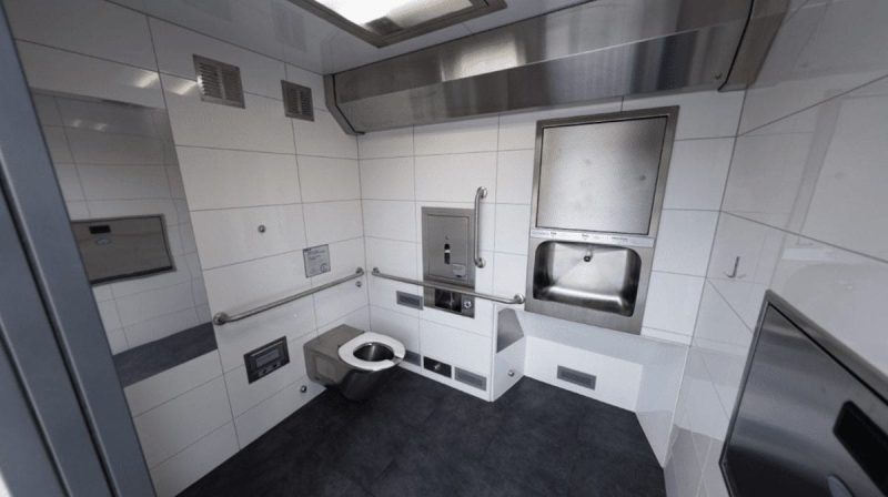 El baño, comparado con las películas espaciales de Star Wars, cuenta con la última tecnología: un sistema automatizado limpia los sanitarios cada 30 segundos, el papel higiénico se dispensa de manera automática y cuenta con dispensadores de agua y jabón, también robotizados. Esta automatización evita el contacto y previene de un posible contacto del coronavirus.