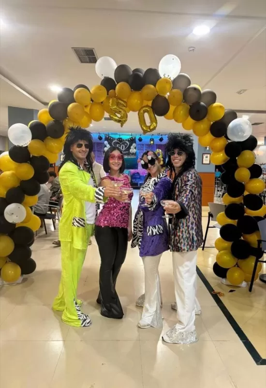 La celebración del 50 aniversario fue un auténtico viaje al pasado, con una fiesta temática de los años 70 que hizo revivir la nostalgia y la diversión de aquella época dorada. Los asistentes disfrutaron de una noche mágica con música en directo de los 70’s y 80’s, una deliciosa tarta de aniversario y la animación del equipo del resort, que se transformó en personajes icónicos de la década. El ambiente estuvo lleno de color y diversión, con un concurso que premió al mejor look setentero y que animó a todos los invitados a sumergirse en la temática de la fiesta.