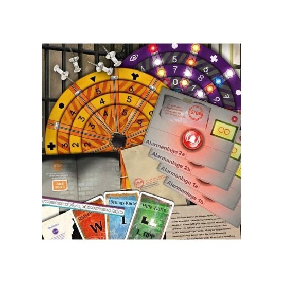 Para ayudarnos a resolver este problema, contamos con un disco decodificador que nos ayudará con los códigos. Tendremos también 91 cartas, divididas entre 26 cartas de acertijo (rojas), 35 de resolución (azules) y 30 de ayuda (verdes). Además, contamos con un cuaderno de notas, una peana, un mapa y 20 objetos especiales que serán parte de la narrativa del juego.