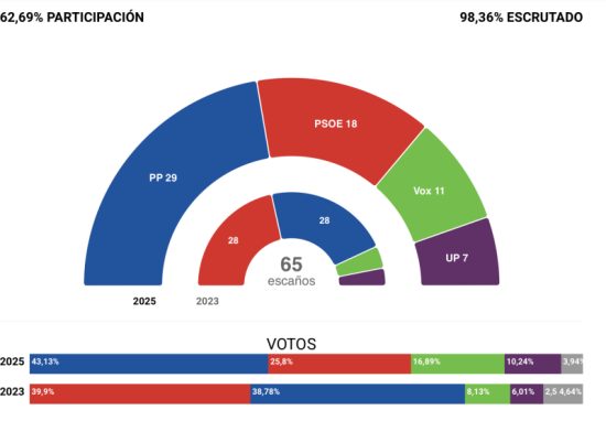 El PP se queda a cuatro escaños de la mayoría absoluta al conseguir 29 diputados en las elecciones autonómicas de este 21 de diciembre, uno más que en 2023, mientras que el PSOE pierde 10 escaños y se queda con 18, y Vox se dispara hasta los 11 diputados, frente a los cinco que tenía en 2025.