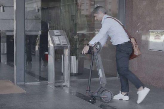 El soporte V-mount de la firma Techmotion Electronics ofrece grandes ventajas para transportar el patinete eléctrico en el transporte público y en lugares muy concurridos o con muy poco espacio como los ascensores.