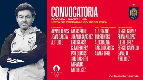En la convocatoria de 22 jugadores, de los cuales sólo 18 participarán en la cita y cuatro acudirán como reservas, destaca también la presencia del central del Girona Eric García, que participó en el pasado Mundial de Catar con la selección absoluta, y que disputará sus segundos Juegos Olímpicos, al igual que Juan Miranda (Betis), mientras que ha entrado el defensa Pau Cubarsí (FC Barcelona), que se cayó de la prelista de la Absoluta para la Eurocopa.