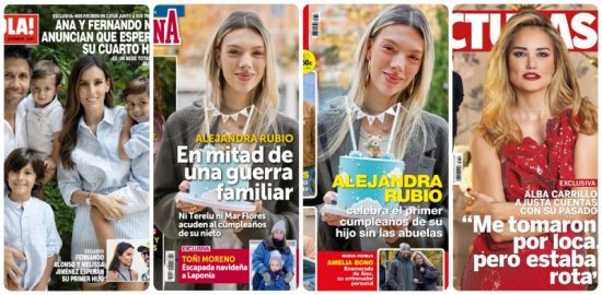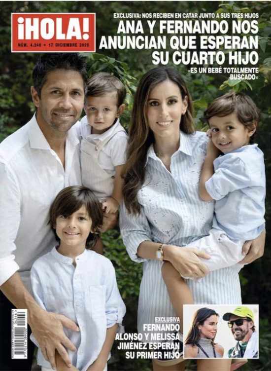 ¡Hola! presenta una portada prácticamente monográfica: Ana Boyer y Fernando Verdasco volverán a ser padres. Un cuarto hijo “totalmente buscado” se sumará a los tres que ya tiene la pareja, Miguel, Mateo y Martín. Resta saber si han pensado en un nombre que comience también por M para el nuevo miembro de la familia. La otra noticia va en la misma línea: también esperan un hijo el piloto Fernando Alonso y la periodista Melissa Jiménez, el primero de la pareja.