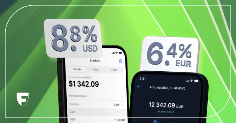 Pero no es lo único. Los intereses en los planes de ahorro de Freedom24 a largo plazo también han aumentado y alcanzan ahora un nivel 1,5 veces superior a los tipos SOFR y EURIBOR a un plazo fijo de 12 meses. Para las colocaciones a 3 y 6 meses, se aplican tipos de interés con coeficientes de 1,1 y 1,25 sobre el SOFR y el EURIBOR, respectivamente. Así, con referencia al 10 de febrero, el rendimiento máximo del plan de ahorro a largo plazo de Freedom24, incluidas las bonificaciones, es del 6,4% en euros y del 8,76% en dólares. Así pues, los tipos son dinámicos, pero se fijan en el momento de la colocación y permanecen sin cambios durante el plazo elegido.
