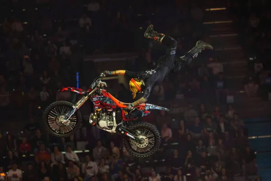 A las 20:00 h en punto, el show arrancó oficialmente con una entrada épica: seis motos surcando el aire por encima de una torre humana de “Castellers” de cuatro pisos, una imagen que dejó boquiabiertos a todos. Los mejores pilotos europeos saltaron a la acción, iniciando las rondas de saltos con figuras como el portugués Diogo Ribeiro, Raúl Lerena, Greg Rowbottom, Pedro Moreno, el campeón del mundo Dany Torres y el piloto estrella Andreu Lacondeguy.