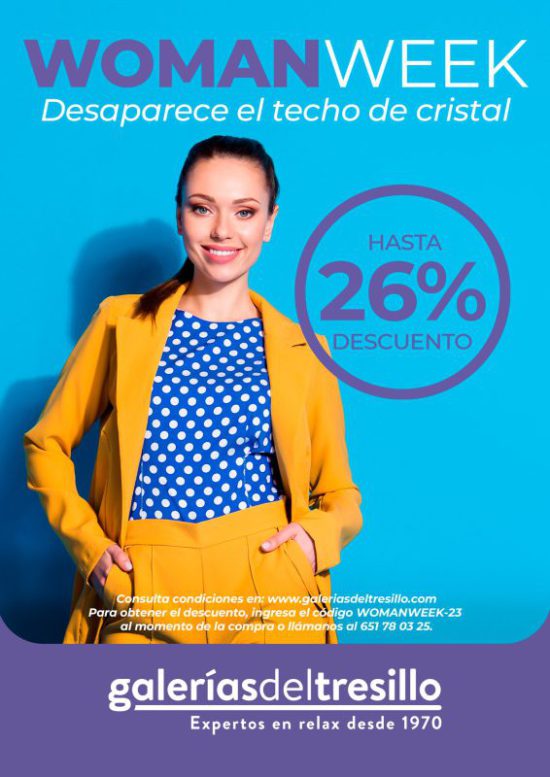 De esta manera, las mujeres podrán visitar cualquiera de las 21 tiendas de esta cadena de muebles (https://www.galeriasdeltresillo.com/tiendas) o entrar a la web www.galeriasdeltresillo.com y tras presentar el cupón WOMANWEEK-23 obtendrán el descuento de manera directa y exclusiva.