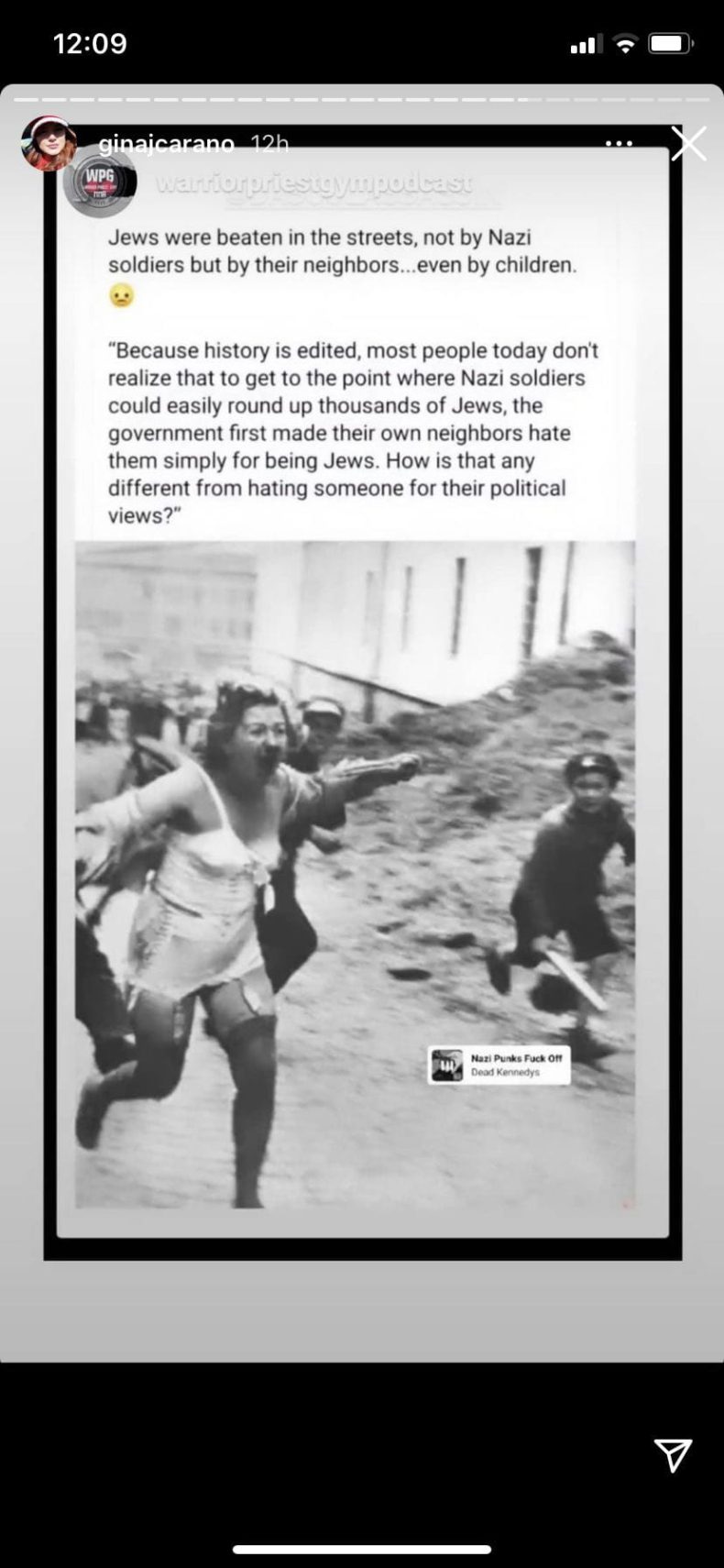 «Los judíos fueron golpeados en las calles, no por los soldados nazis sino por sus vecinos», escribió la actriz el miércoles en una publicación de Instagram que fue eliminada a los pocos minutos.